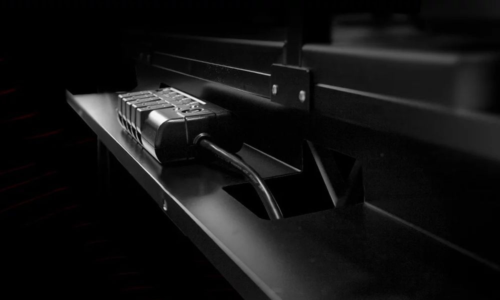 幅 12 cm のトレイは、ケーブルで煩雑になりがちなワークステーションの裏側を整理してくれます。