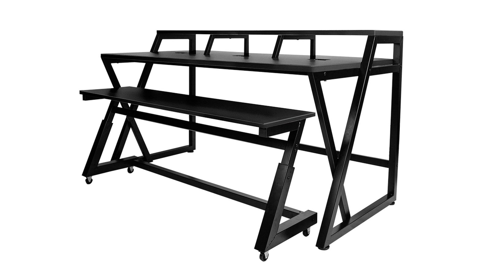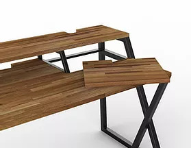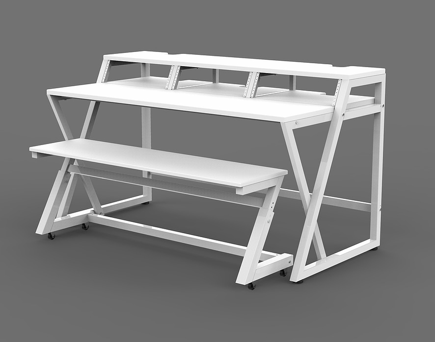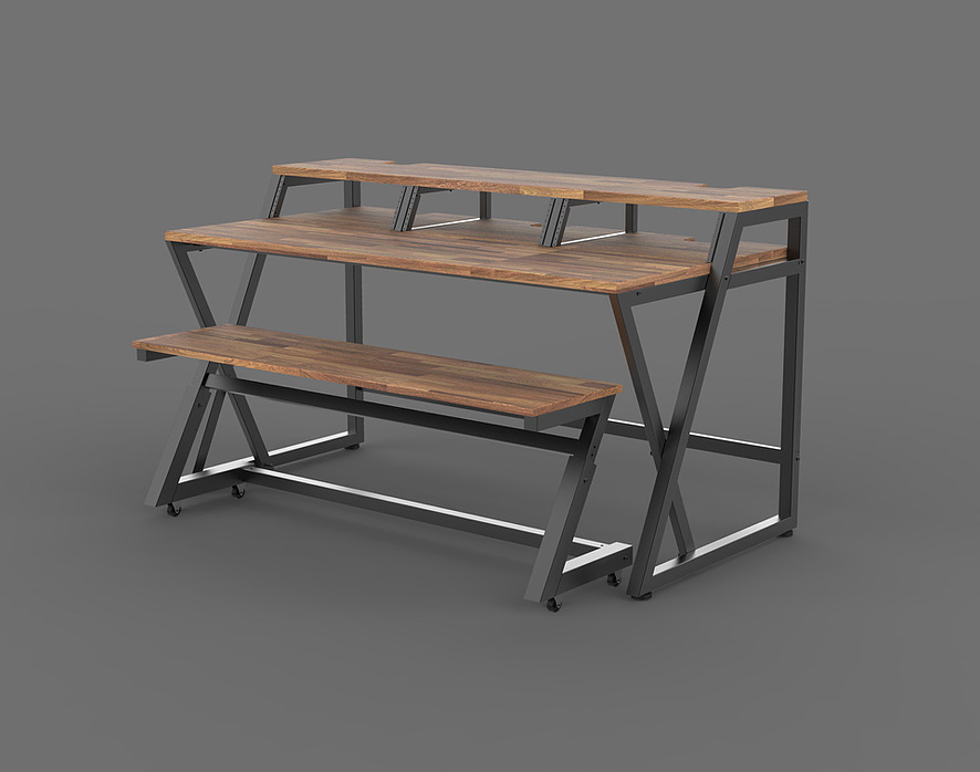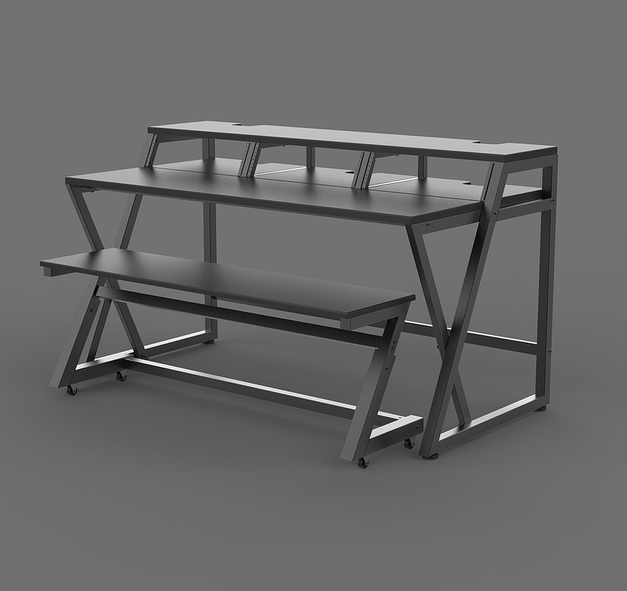 モニタースピーカー、17インチのラップトップ、レコーディング・ツールキットなどを適切に配置されるよう設計されたスタジオ・デスクです。独立型のキーボードスタンドは、お持ちの 88 鍵盤のスイートホームとなります。