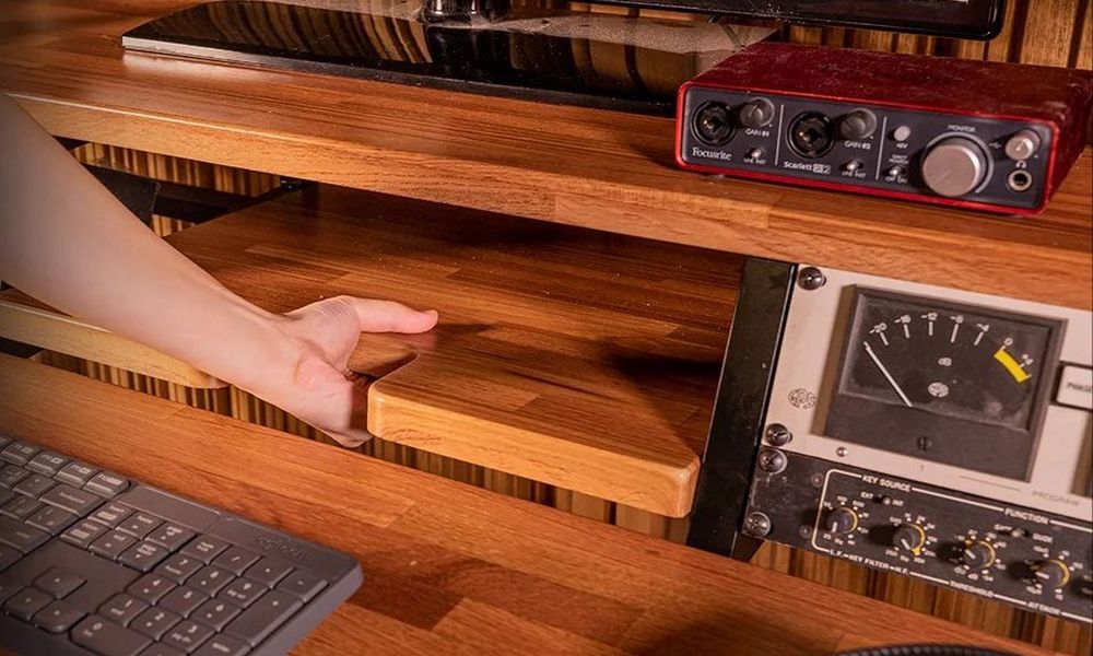 取り外し可能なテーブルボードを取り付ければ、9U のラックは小さいインターフェース、楽譜、プレイステーション(!)なども置ける収納スペースに変わります。