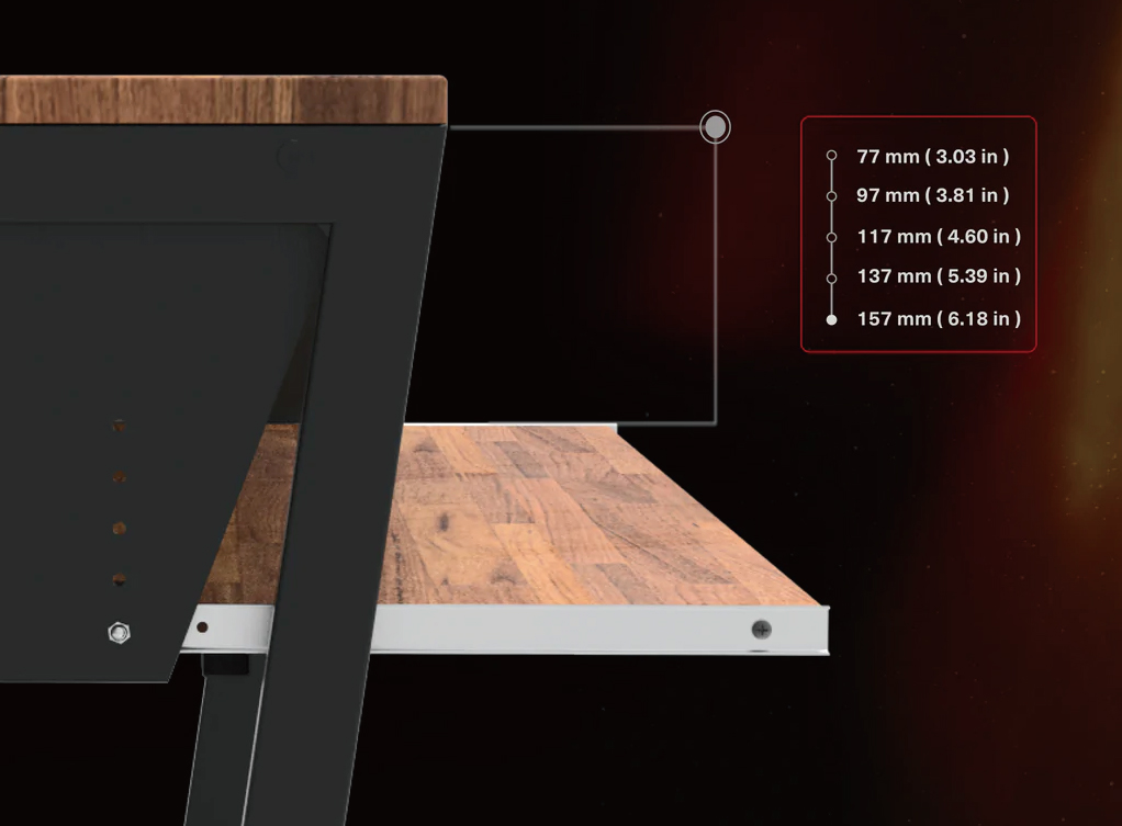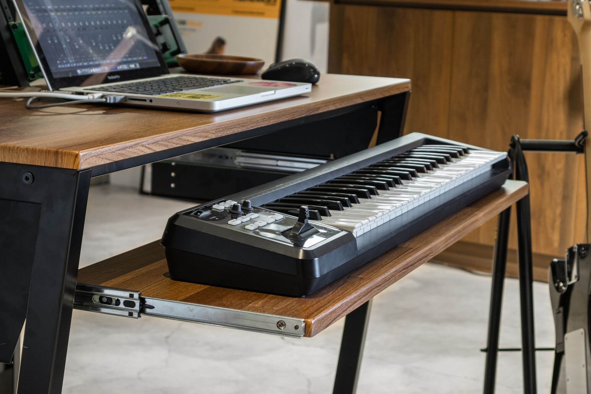 Star Rover のキーボードトレイは、メインデスクの延長として940×300mmの面積を確保しています。49鍵のMIDIキーボードやその他のプロフェッショナルツールのほとんどにもフィットするため、しっかりと配置することができます。