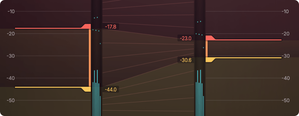 しきい値やレシオ値を推測するのはもうやめましょう。オーディオのダイナミックレンジをリアルタイムで視覚的に把握できます。入力信号と出力信号を並べて表示し、直感的にサウンドをシェイプできます。