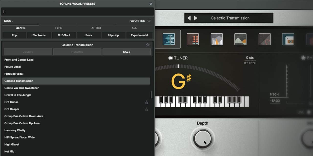 Topline Vocal Suiteでハードチューニングや空間、モジュレーション、ダイナミクスのエフェクトを調整し、最高のボーカルミックスを実現できます。