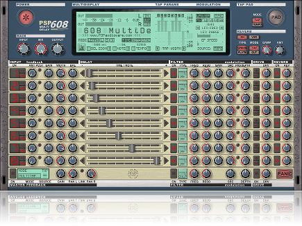 PSP 608 は完璧な機能を持ったディレイプラグインです。機能的だけでなく、クリエイティブなツールを提供できるよう努めました。各タップには、選択可能なフィードバック、ステレオイメージ、ポジション、ディレイタイム、マルチモードフィルター、モジュレーション、ドライブ/テープサチュレーションとリバーブを搭載しています。またフィードバックとドライブは、サウンドデザインのオプションとしてシグナルチェーンの先頭、または最後尾に置くことができます。モジュレーションセクションでは、LFO エンベロープフォロワーの両方で構成され、テープサチュレーションアルゴリズムは、我々のマスタリングプロセッサーから移植しています。そしてもちろん、このすべての動作は最大24 ビット、192kHz までのビットデプスとサンプリングレートに対応しており、MIDI とホストシーケンサーでのオートメーションにも完璧に対応しています。