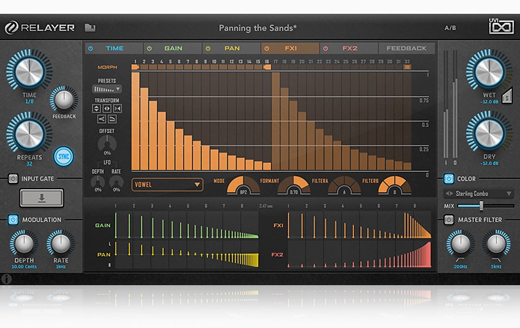 Relayerのコアは最大で32タップのバリアブルマルチタップエンジンです。ディレイタイムはフリーまたはホストシンクしたタイムを設定することが可能です。加えて、スウィングとワープコントロールが弾むような感じのバウンシングエフェクトを即座に生み出します。中央のタブは、タップ数に応じたステップのモジュレーションエディターでこれまでにないコントロールと柔軟さをもたらします。画面上の各セクションを思いのままに一通り操作することで、タイム、ゲイン、パン、そして2つのバリアブルマルチエフェクトを的確にコントロールできることを知ることでしょう。もちろんこれらのパラメーターはDAWのシーケンスと連動したり、あるいはプリセットを使用して時間とともに変化するさまをお好みに合わせて調節することも可能です。