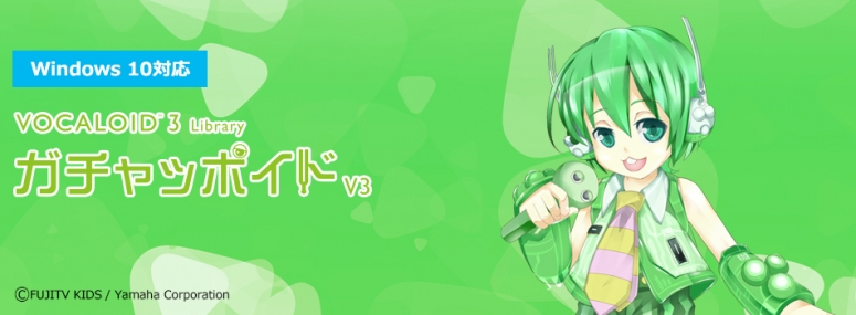 「VOCALOID™3 ガチャッポイド V3」は、放送40周年を迎えた国民的キャラクター『ガチャピン』の声をベースに制作したボーカル(歌声)作成ソフトウェアです。(企画:株式会社フジテレビKIDS、ヤマハ株式会社 開発:ヤマハ株式会社) VOCALOID™3 Editor 新合成エンジンの特長を生かした高音質ライブラリで、同梱の「Tiny VOCALOID™3 Editor(Windows版)」でメロディ(旋律)と歌詞を入力すれば、あらゆるジャンルにあわせたボーカルの歌声が作成できます。 |