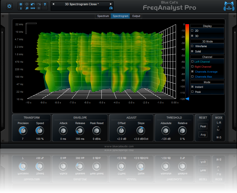 3 つのモードは、インスタント、ピーク、アベレージレスポンスがあり、同じグラフ内に表示できます。ズーム機能と表示調整により、より正確にスペクトルの特性を測定できます。4 つのメモリースロットには、任意のカーブを保存することができるので、非常に簡単に複数のトラックやエフェクトを比較することができます。スペクトログラムビューが加わったので、2D または3D(3D ウォーターフォールモード)で、時間経過によるスペクトルの変化を監視することができます。すべてのチャンネルにこのビューと、正確な座標表示とズーム機能が用意されています。