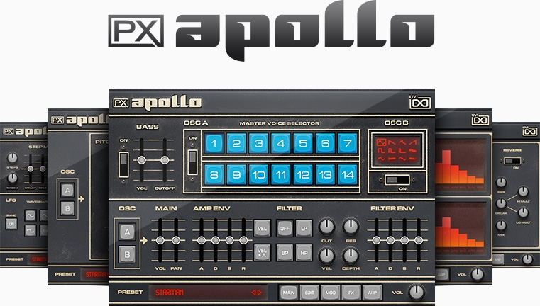 PX Apolloは、最新のUVI Workstation(無償配布のサンプルインストゥルメント)もしくは15オシレーター、80エフェクト、モジュレーター、スクリプトイベントプロセッサーなどを装備したUVIのプレミアムハイブリッドインストゥルメントである Falconのサウンドバンクとしてご利用いただけます。