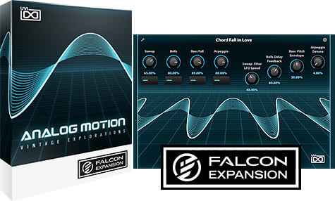 Analog Motion は Falcon 専用のエクスパンション(拡張ライブラリ)です。Falcon は先進的なシンセシスとソフトウェアアーキテクチャーが特長で、15 種類のオシレーター、80 以上のエフェクトを装備します。また直観的で素早い操作を基調とした画面設計によって、基礎的な操作と深いサウンドバンクデザインのどちらでも快適に扱うことができます。すべてのプリセットにマクロコントロールが用意され、その音色のキーとなるパラメーターに素早くアクセスできるようにプログラミングされています。さらにカスタマイズとより高度な演奏のために、MIDI、OSC あるいはホストオートメーション対応で、Lua スクリプトによる制御も可能です。