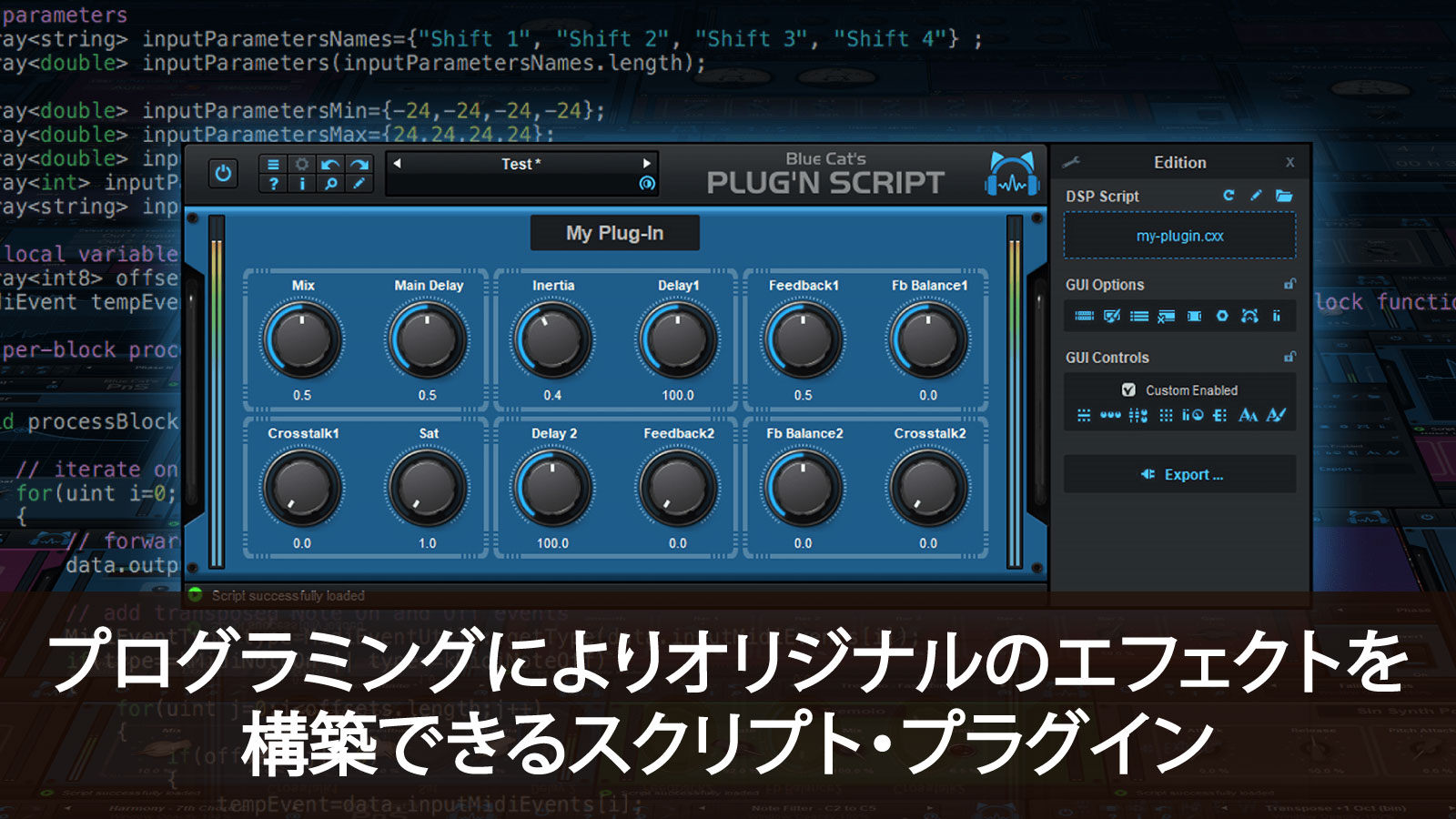 このプラグインを使うと、プログラミングに関してあまり知識がなくても、オリジナルのエフェクトを作成することができます。つまり、すべてのプラグラミングのフォーマットを学ぶのに無駄な時間やお金を投資する必要がないのです。そしてすべてサポートされています。プログラミンに関してあまり興味がないという場合でも、Blue Cat Plugin Script では、すでに存在するスクリプトでの通常のプロセッサーとして、また誰かが作成したこのとても特別な効果、それはこれまで何年も探してきて、そして見つけることができなかったものを簡単に実現することができるのです。