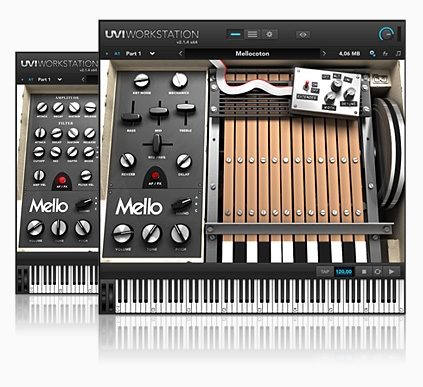 そして Mello(メロ)、我々はソフトウェア音源としてこの歴史的な楽器の魅力の完全再現に挑みました。この作業に3台のマシーンを用意し、数々のオリジナルテープの音色を丹念にマルチサンプリングしました。全ての音を3台のマシーンで鳴らし、集められたサンプルの中からベストな結果を残しました。こうして完成した 28 の音色は、どれも鍵盤操作や内部構造によるノイズが収められ、実機を演奏しているかのような生々しさを実現します。これらのメカノイズはステレオで収録され、キーオフやテープノイズも用意し、お好みに合わせてミックスすることができます。さらに、オリジナルのハードウェアと同様、リバーブも装備します。
