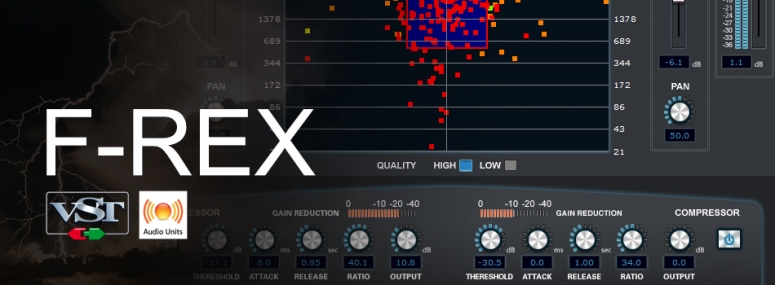 F-REXは音楽データをリアルタイムに解析し、音量、周波数、定位の三要素をビジュアル表示。