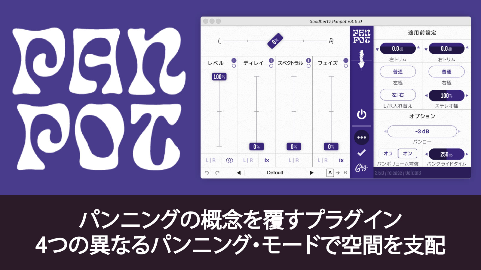 PANPOTは、1つのプラグインで、4つの異なるパンニングモードにより、これまでのパンニングに対する考え方を一蹴するエフェクトです。