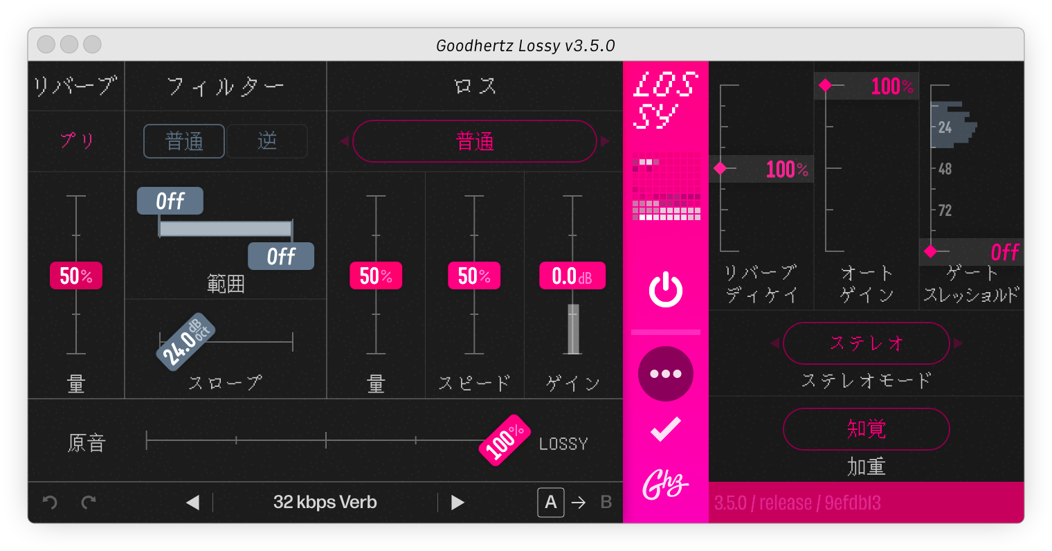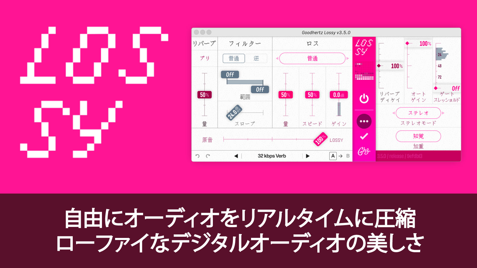 90年代、あの56Kストリーミングでの音楽配信のようなデジタルロスのような音を再現する画期的なプラグイン。リアルタイムにMP3ディストリビューション、ビデオジーターノイズ、8bitなレトロなダーティーサウンドまで再現できます。デジタルミニリバーブまで搭載しています。