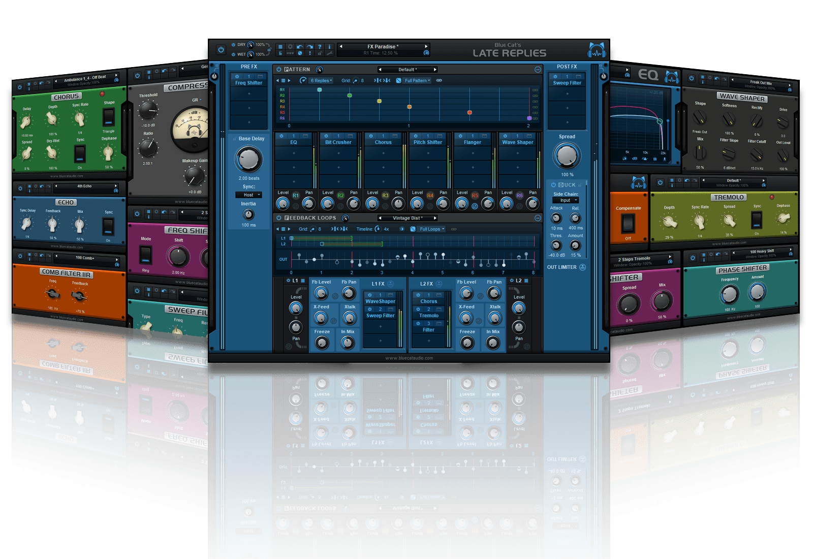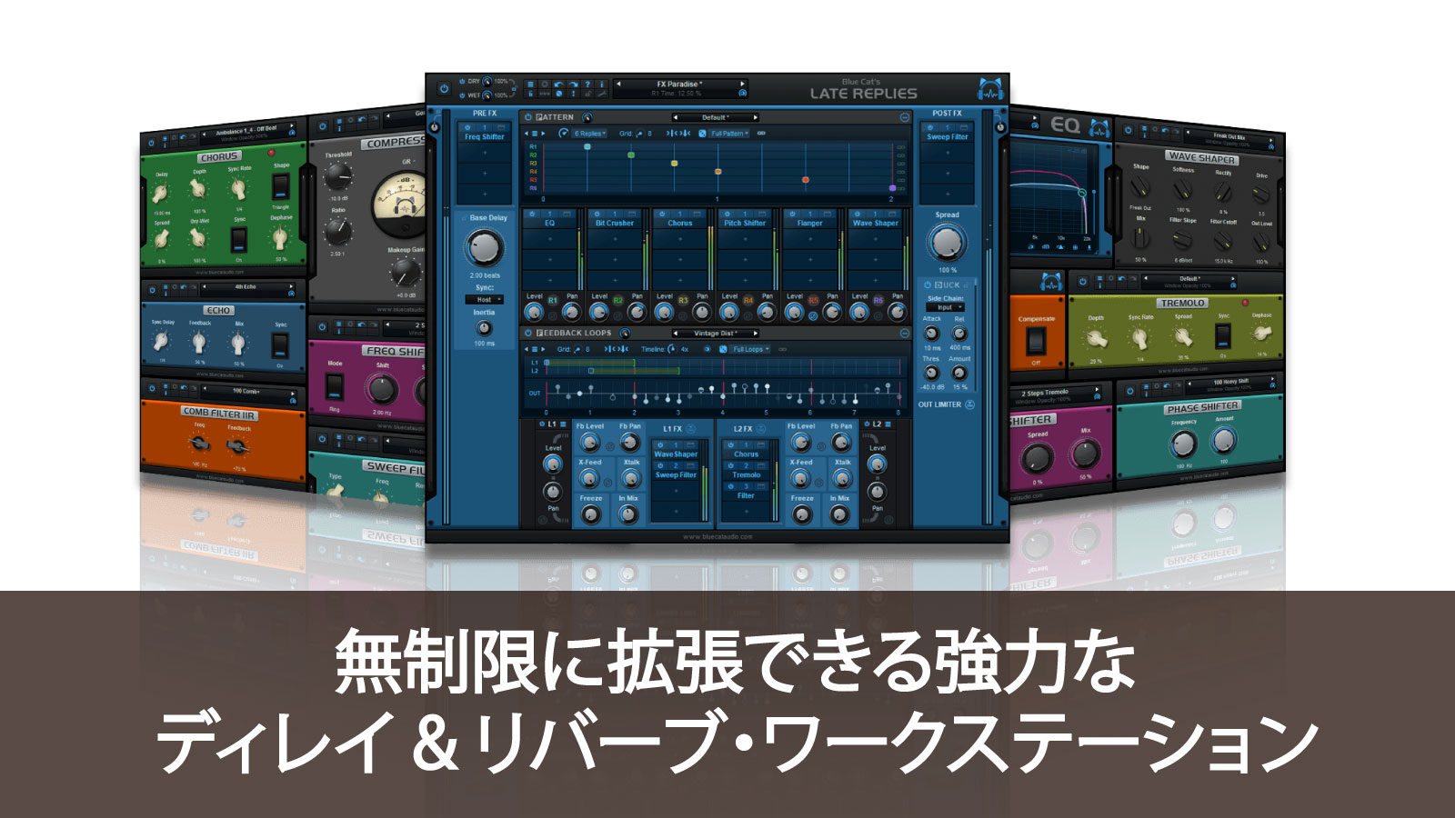 Blue Cat の Late Replies は、サードパーティーの VST、VST3、そして AU プラグインとして信号経路にアサインすることで、無制限に拡張できる強力なディレイ、およびマルチエフェクトプラグインです。独特な位相幾何学を持つこのプラグインは、巨大なパワーを持つフル機能のディレイマシンです。