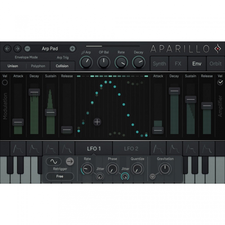 Aparillo(アパリロ)は、壮大で映像的なサウンドを奏でる、先進の16ボイスFMシンセサイザーです。「シンセシス」「ウェーブ・シェイピング」「フィルタリング」「FX」「モジュレーション」などを絶妙に配置し、サウンドトラックや劇伴などの音源に最適な、重厚で有機的なサウンドを生成可能。また、独特な「Orbiter」画面でそれら複雑なパラメータを容易に、そして無限にコントロール可能できます。