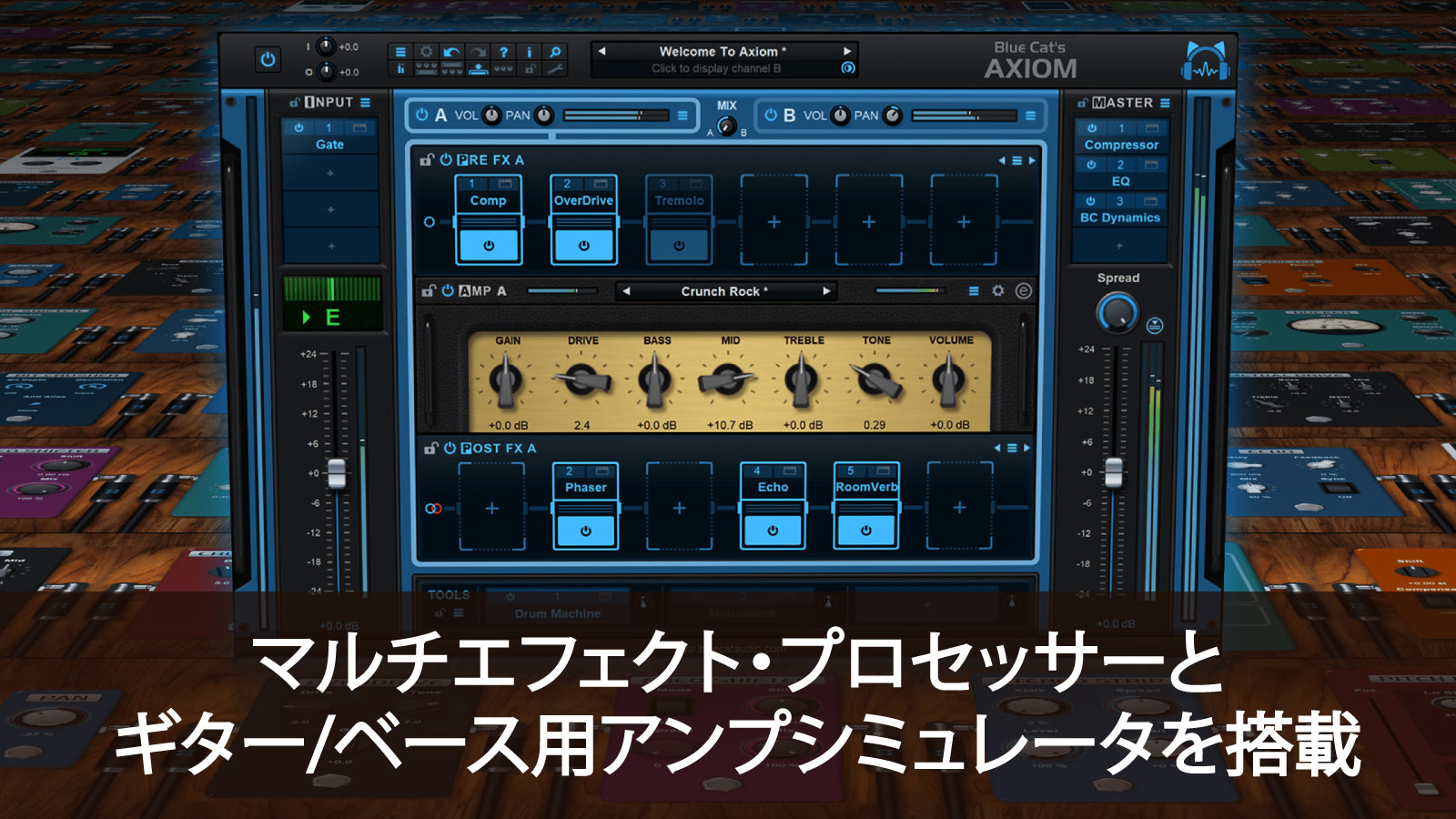 Blue Cat のAxiom は、ギターやベースのためのパワフルかつオープンな設計思想を持つマルチエフェクトプロセッサーとアンプシミュレーションソフトウェアです。Axiom はこれまで各方面でご好評をいただいているBlue Cat アンプシミュレーションプラグインDestructor をベースにした無限の音作りを可能にしたソフトウェアです。