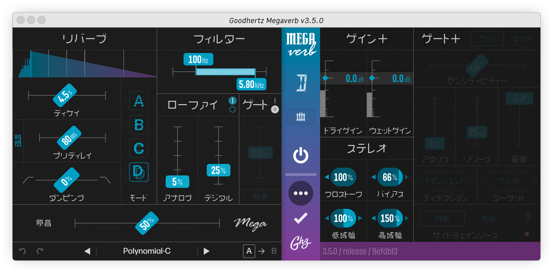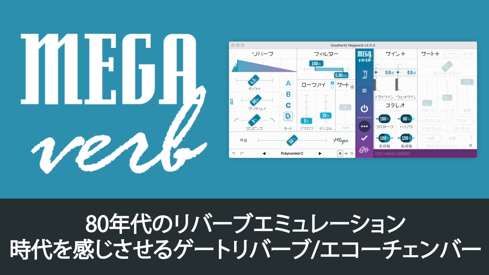 80年代のリバーブエミュレーションとしては世界最高峰のプラグインを開発しました。その頃の特徴的なリバーブサウンド、たとえばゲートリバーブ、花が咲くように広がるリバーブ、ノイズのかたまりの中に溶け込むようなエコーチェンバーなどを再現したのが、今回紹介するMegaverbです。