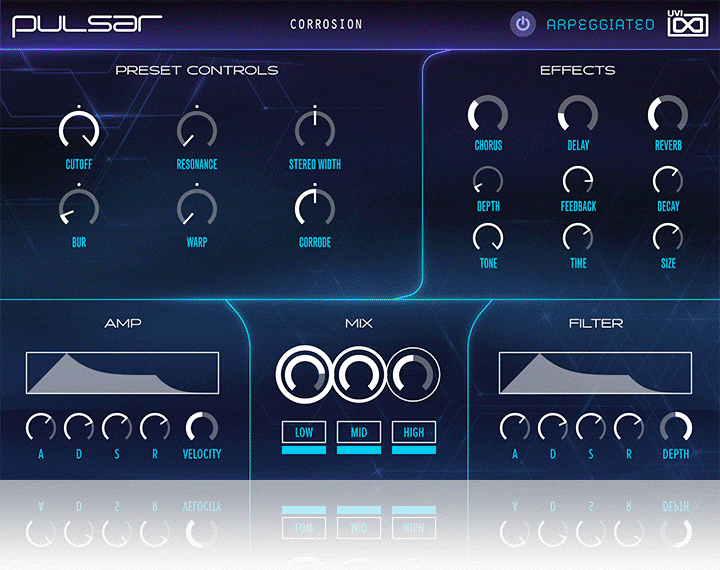 Pulsarのサウンドはどれも表現力豊かな演奏に適したデザインに仕上がり、ADSRエンベロープ、フィルターやエフェクトなど、専用に用意されたマクロコントロールにより、ダイナミックなパフォーマンスを可能にします。もちろんこれらコントロールは楽曲にマッチした調節や音色の仕上げにも最適です。